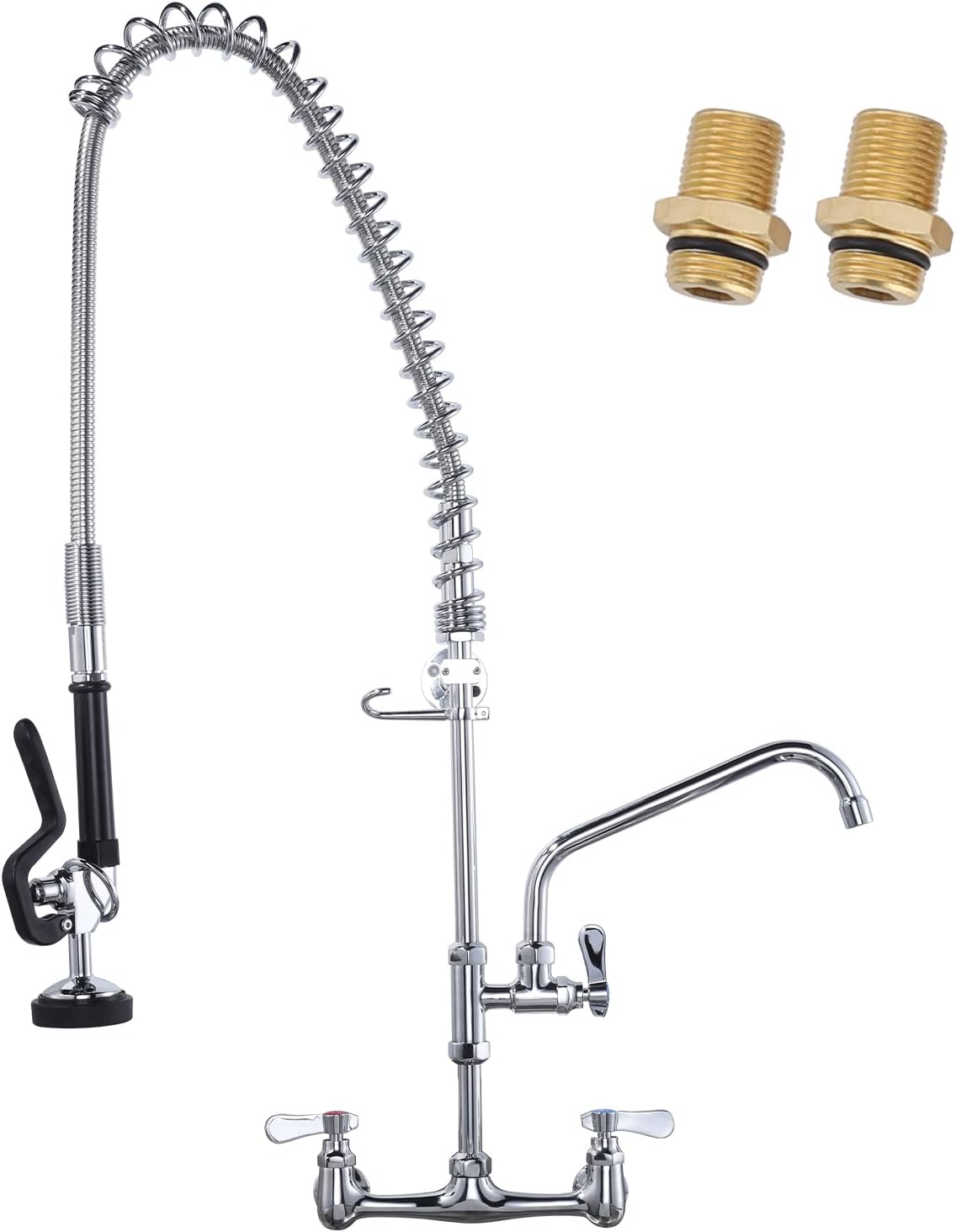 - [Commercial Sink Faucet] – This wall mounted pre-rinse faucet with sprayer and add on faucet is perfect for rinsing excess food and sauces off of your dishes prior to running them through your commercial dish machine. Intended for janitorial and dishwashing use, this commercial kitchen faucet is ideal for dish rooms, schools, grocery stores, kitchens, and more.